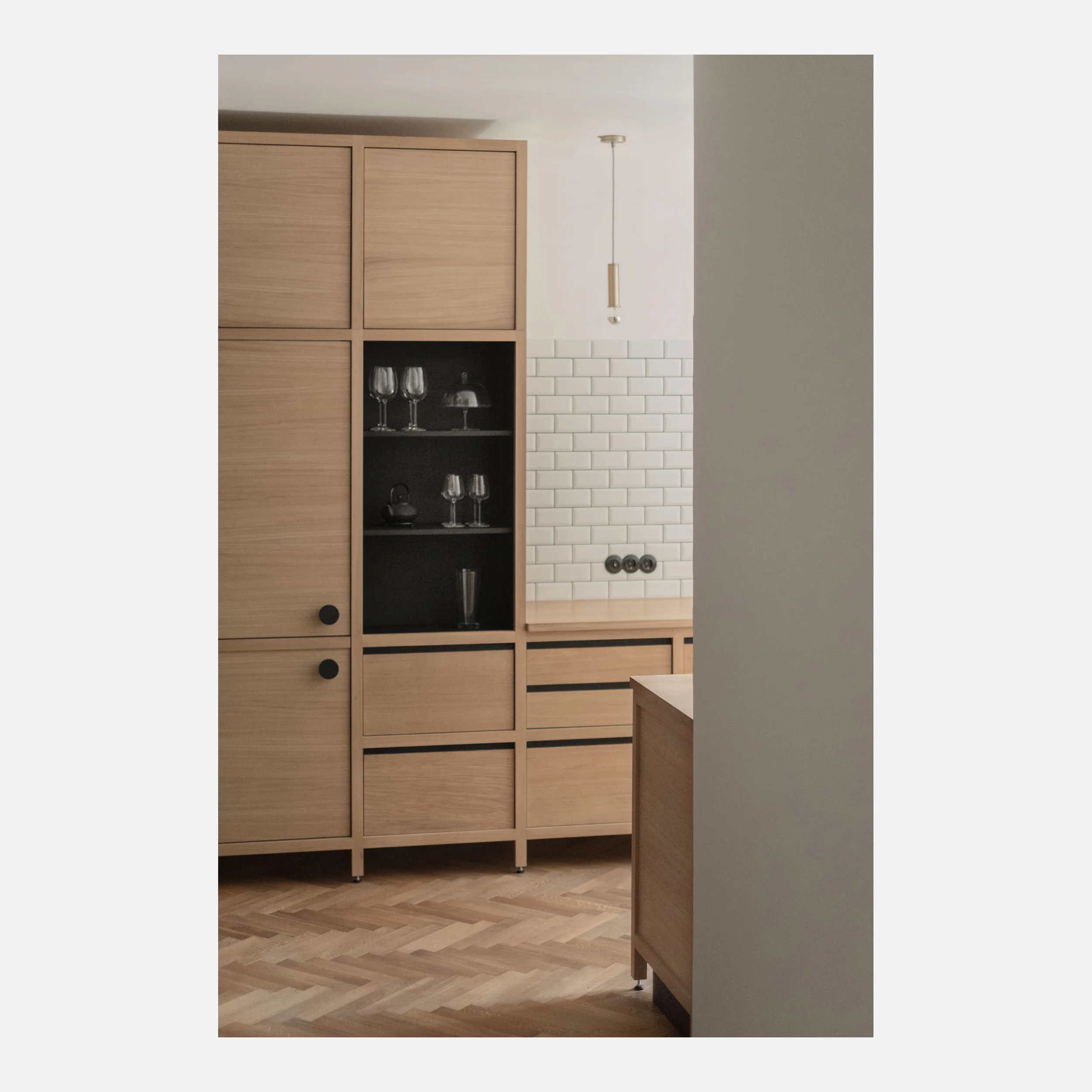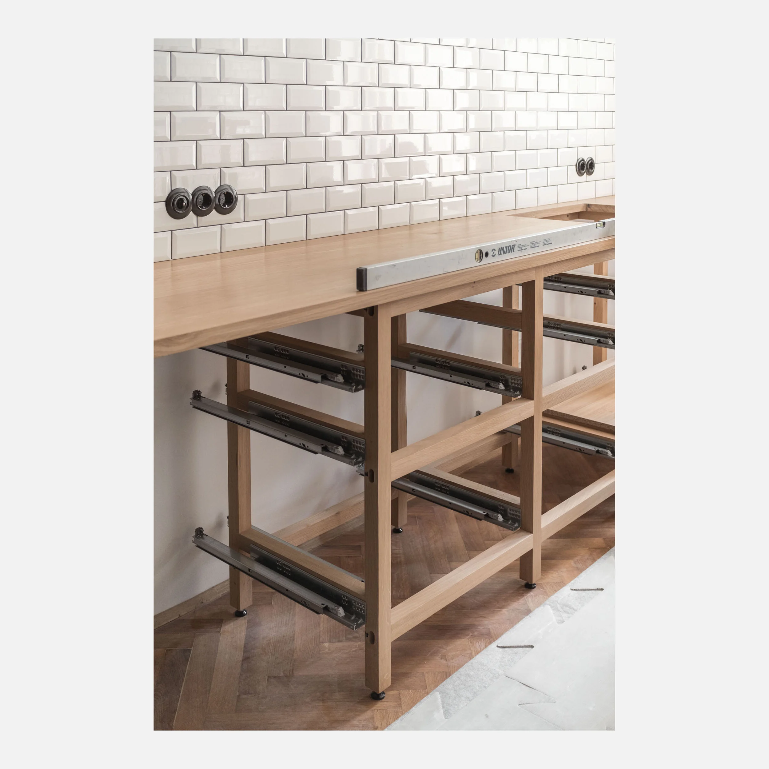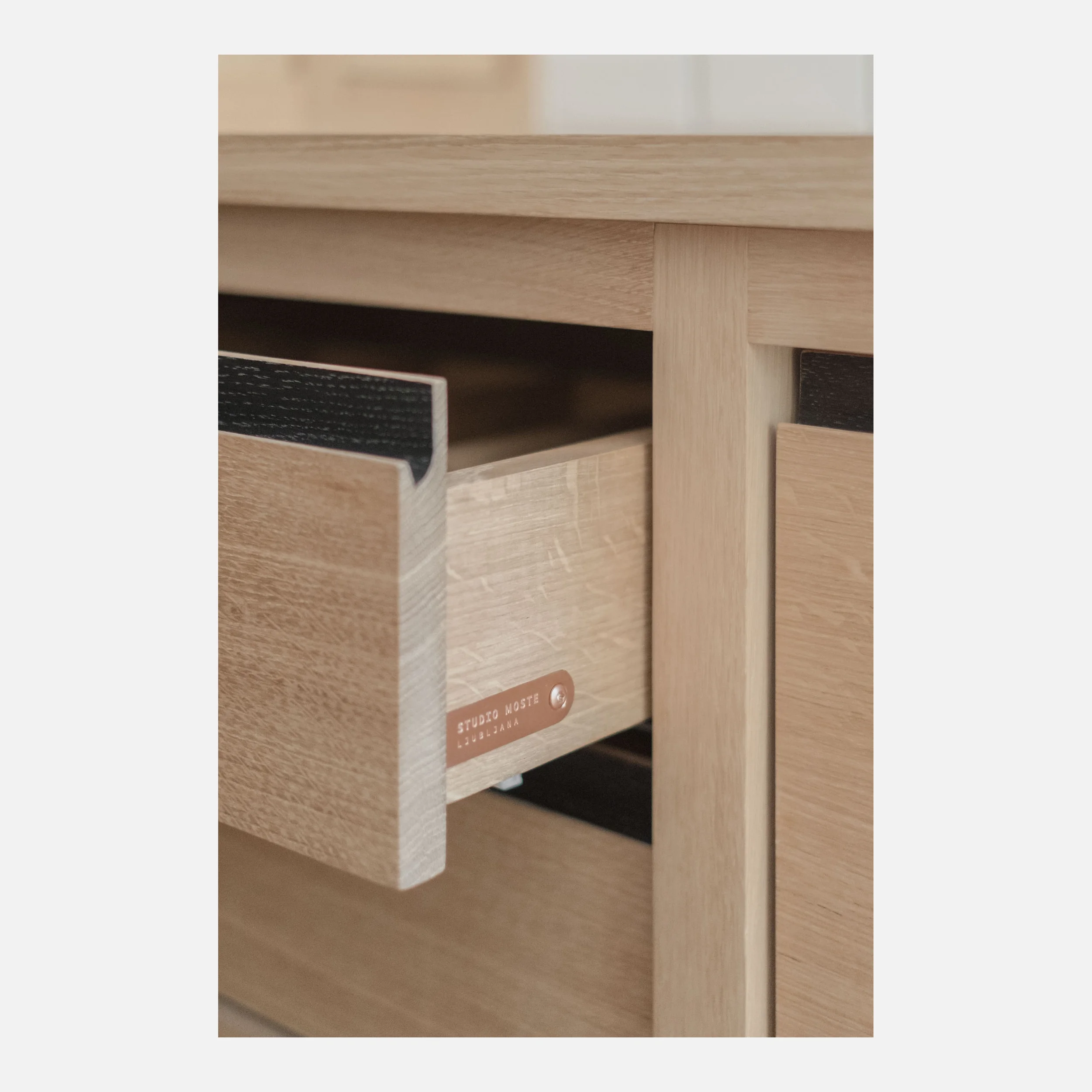 Od prve izdelane kuhinje, ki se je izkazala za uspešno - in do danes opravlja svojo funkcijo enako dobro kot prvi dan, sva skozi naslednje projekte razvijala konstrukcijski sistem in njegove detajle, optimizirala izdelavo in dodala vrsto elementov ter detajlov, ki gradijo oblikovni jezik kuhinj Studia Moste.