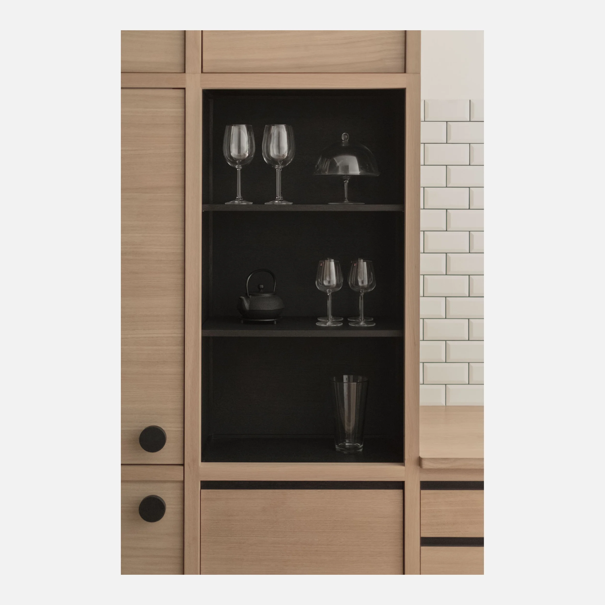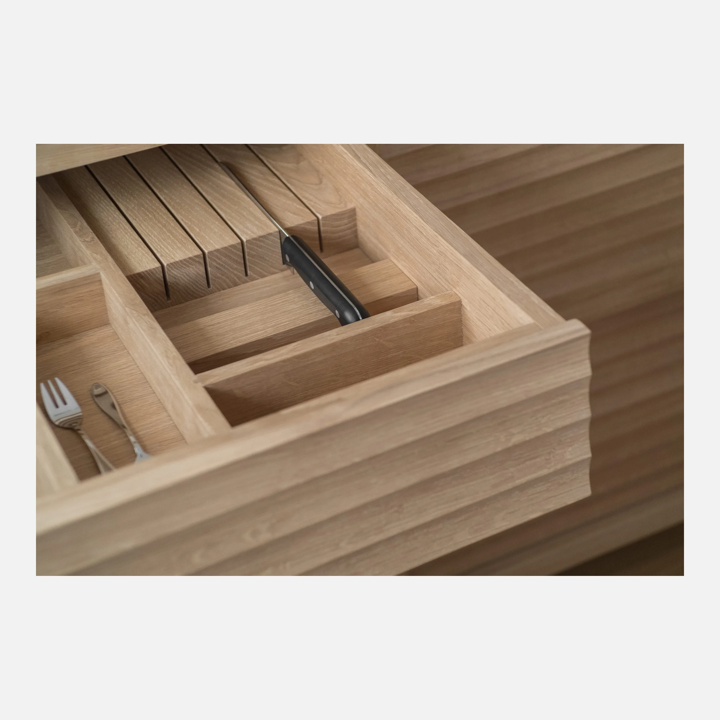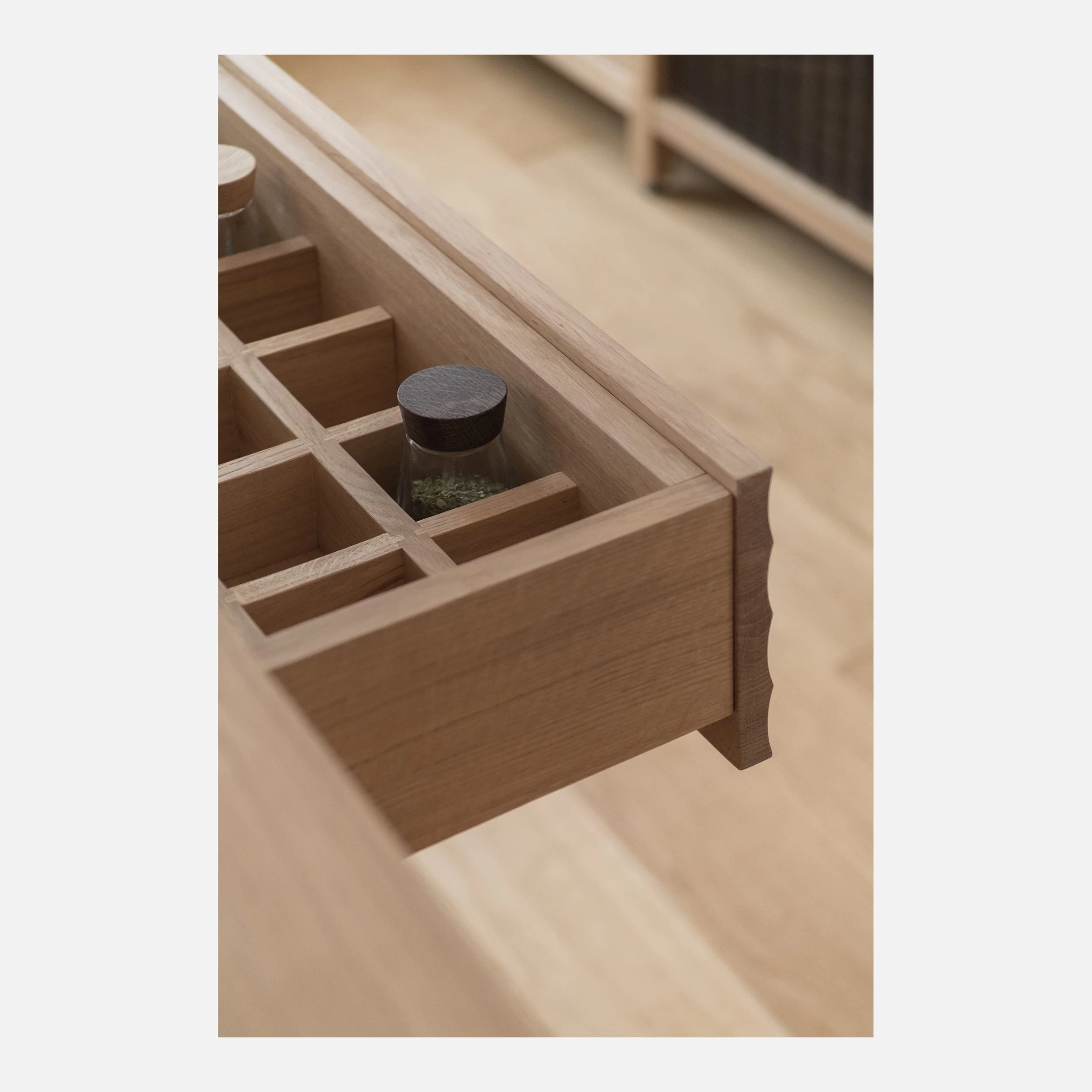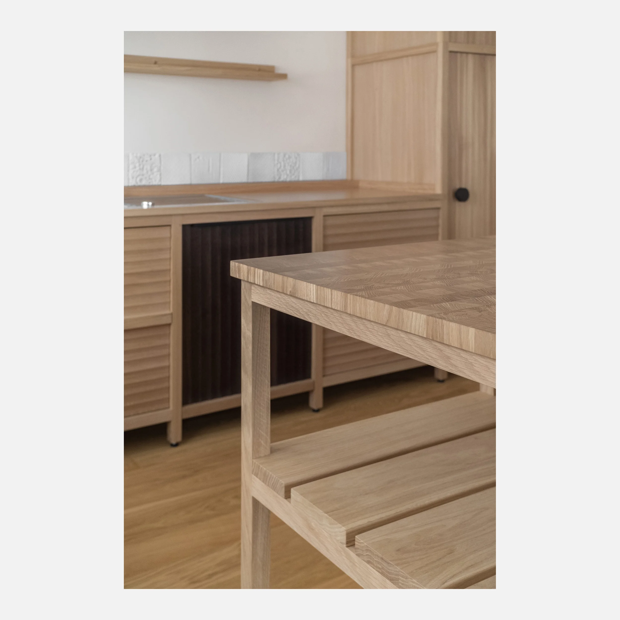 Kljub sistemskemu pristopu pa ne gre za industrijski, ampak obrtniški izdelek. Vsaka kuhinja je oblikovana posebej za prostor, kjer bo postavljena in za ljudi, ki jo bodo uporabljali. Ni standardnih širin elementov in višin pultov - vsaka kuhinja je nov projekt in je v celoti izdelana po meri v najinem studiu.
